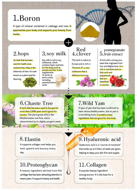A type of minerals which contained in cabbage and nuts. it supports the source of femininity.  It approaches your body and support your beauty from inside.